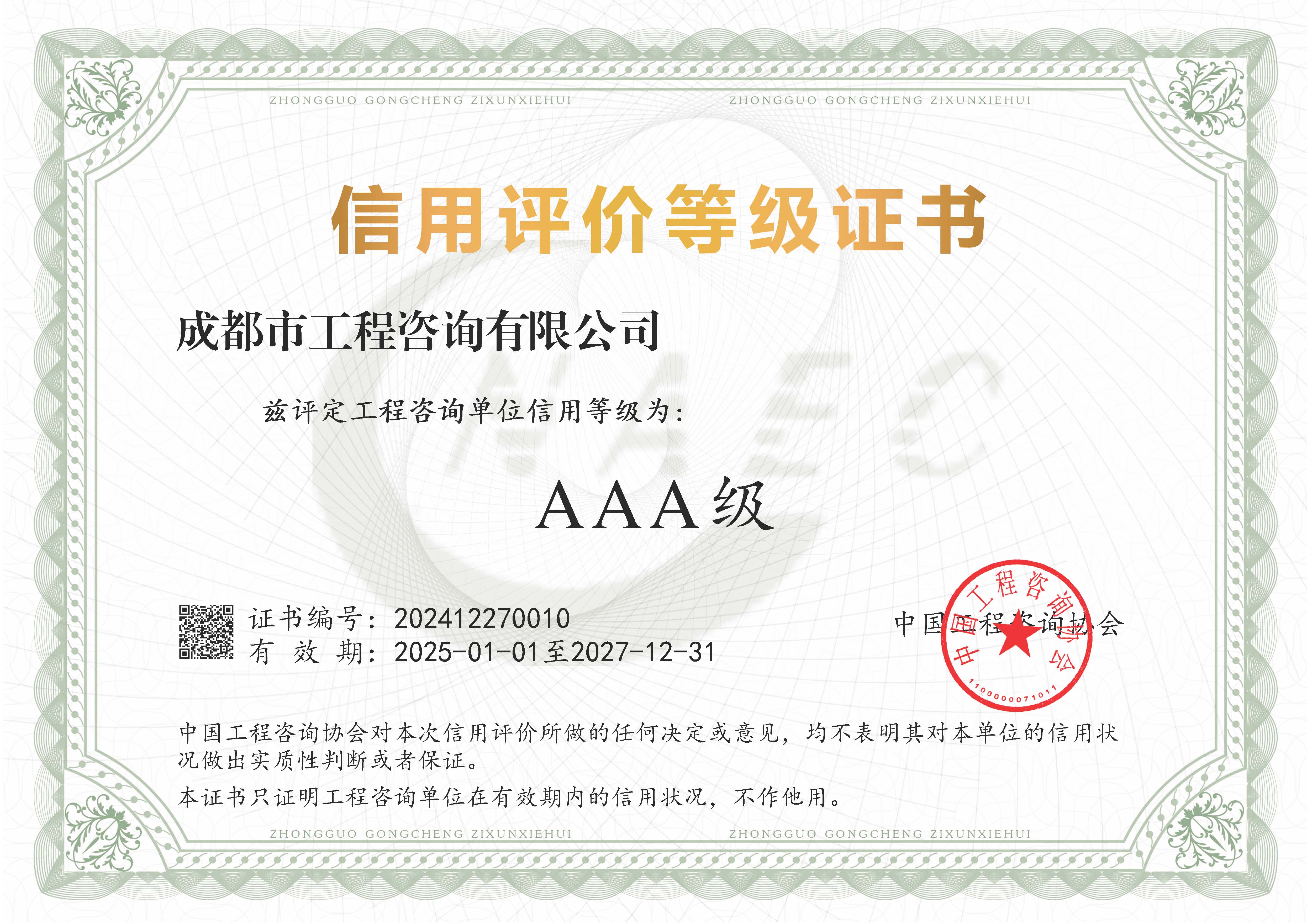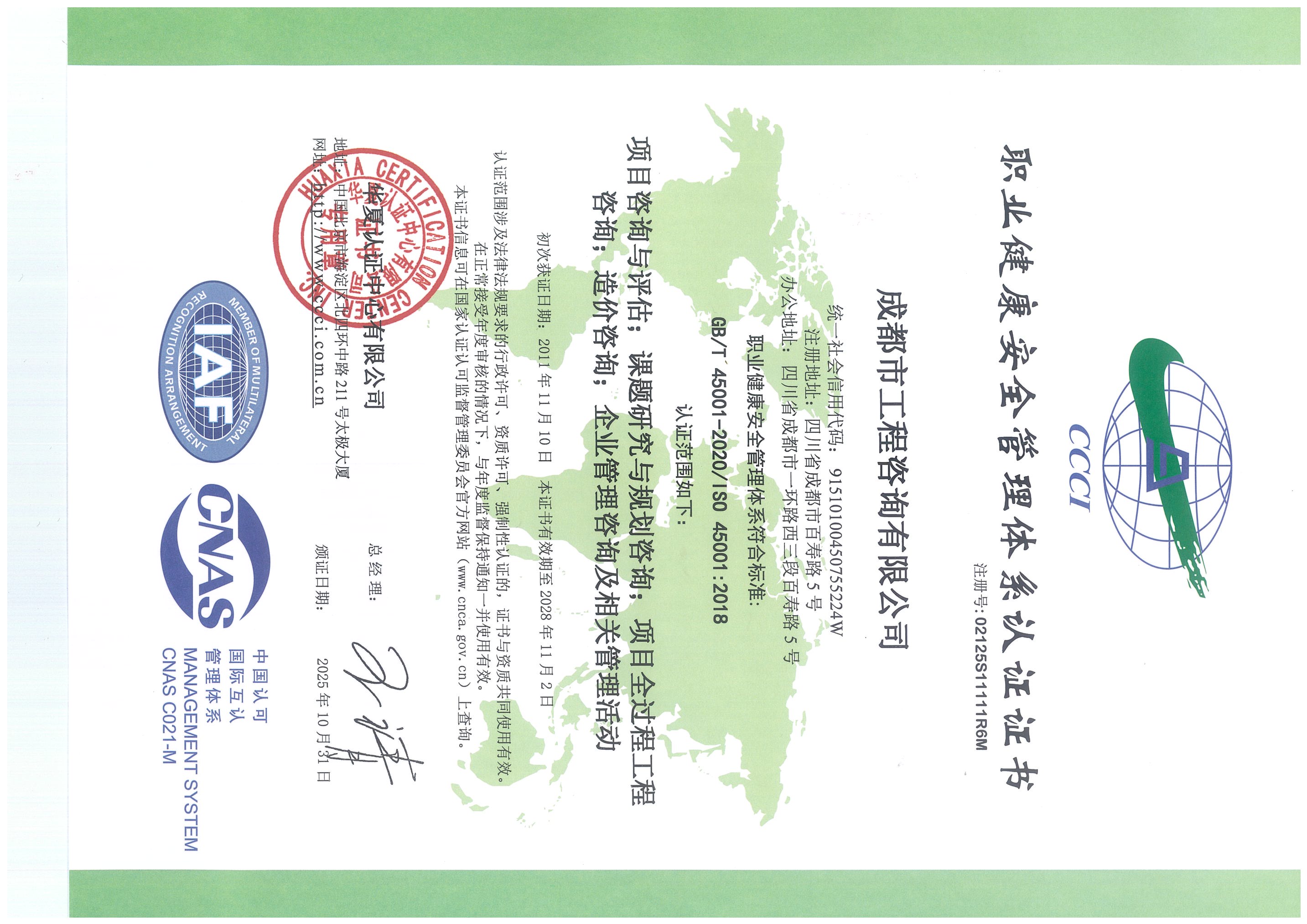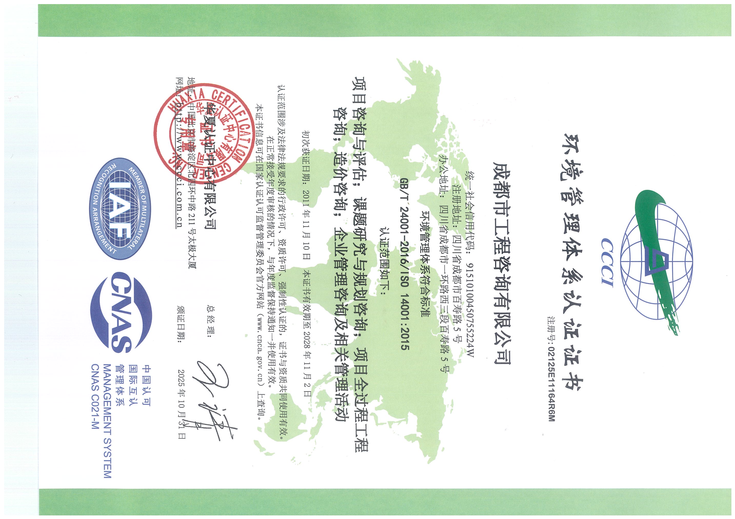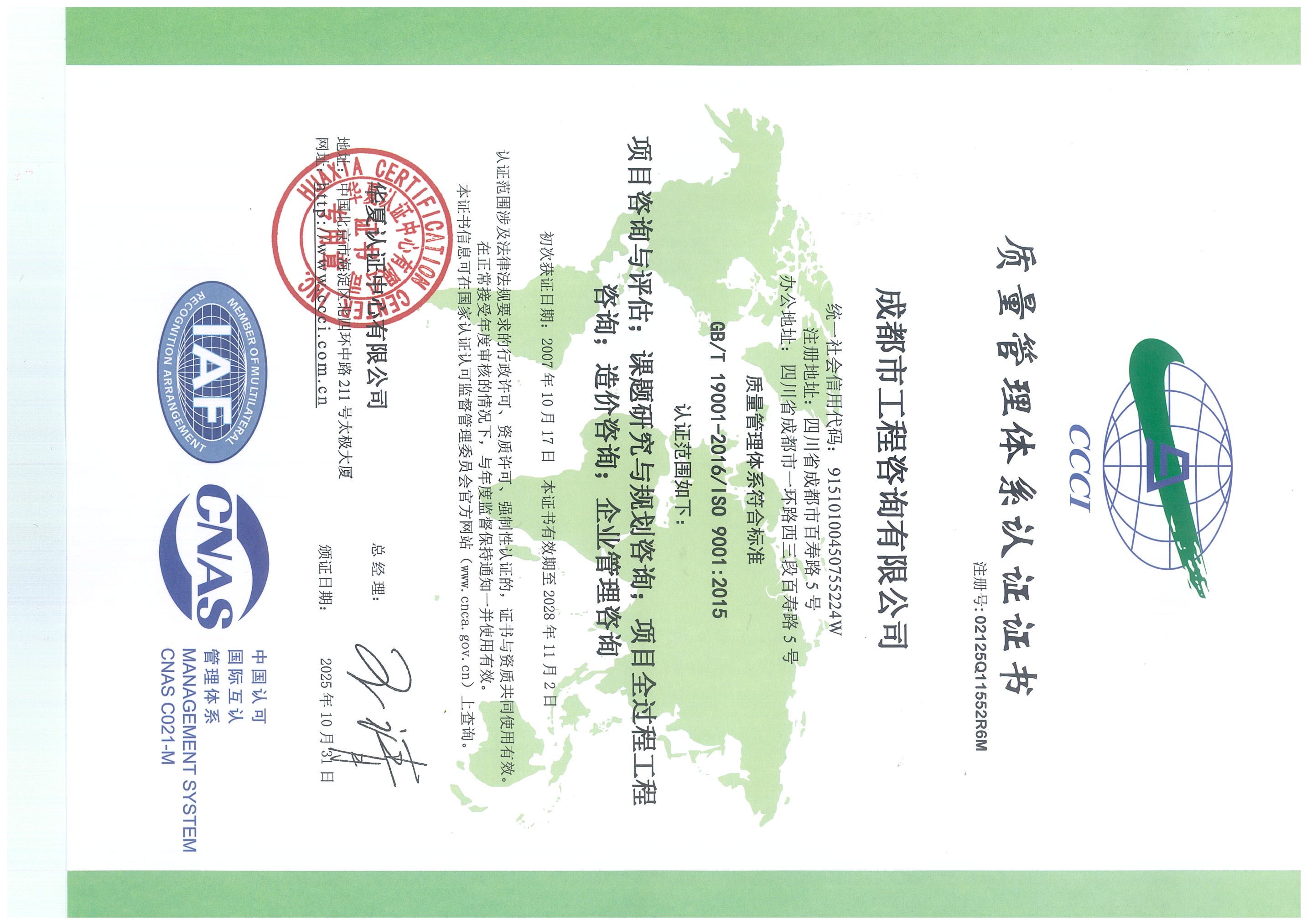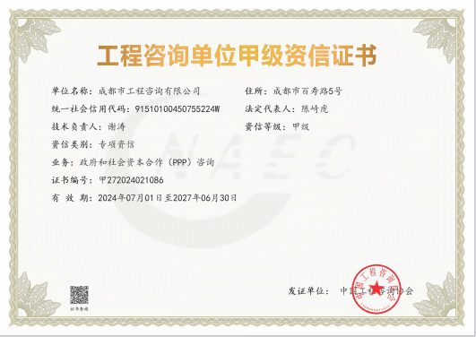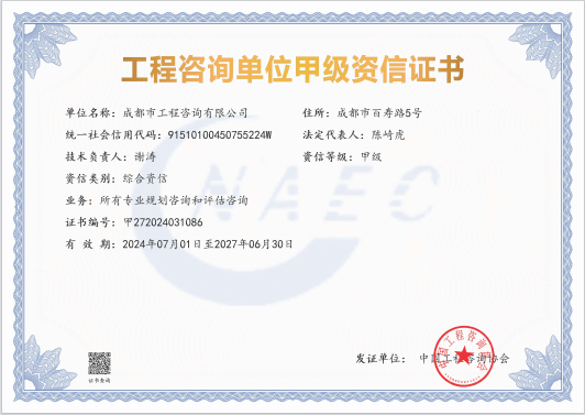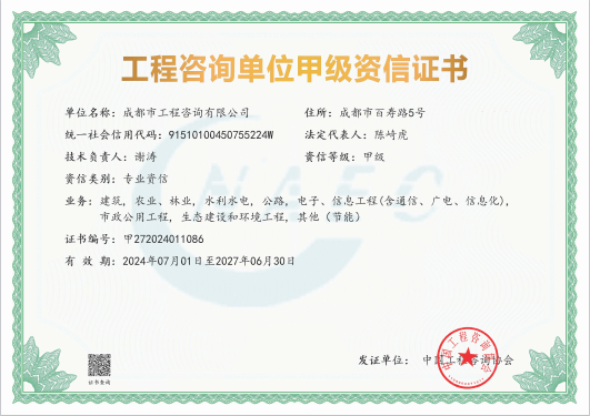 星空体育登录官网_星空(中国)拥有工程咨询甲级综合资信、甲级专业资信和PPP甲级专项资信三项甲级资信证书和工程造价资质。甲级综合资信由建筑,水利水电,农业、林业,电子、信息工程(含通信、广电、信息化),市政公用工程,生态建设和环境工程,公路,其他(节能)8个甲级专业资信和电力(含火电、水电、核电、新能源),轻工、纺织,水文地质、工程测量、岩土工程,建材,铁路、城市轨道交通,其他(土地整理)和其他(旅游工程)7个其他专业组成。星空体育登录官网_星空(中国)现已通过了GB/T19001-2016/ISO9001:2015质量管理体系、GB/T24001-2016/ISO14001:2015环境管理体系和GB/T45001-2020/ISO45001:2018职业健康安全管理体系认证。星空体育登录官网_星空(中国)目前是四川省内唯一同时持有甲级综合资信、甲级专业资信和PPP甲级专项资信证书的综合性咨询机构,是四川省及成都市发展改革部门以及天府新区、东部新区、高新区、武侯区等20余个区(市)县的政府投资项目咨询服务机构。