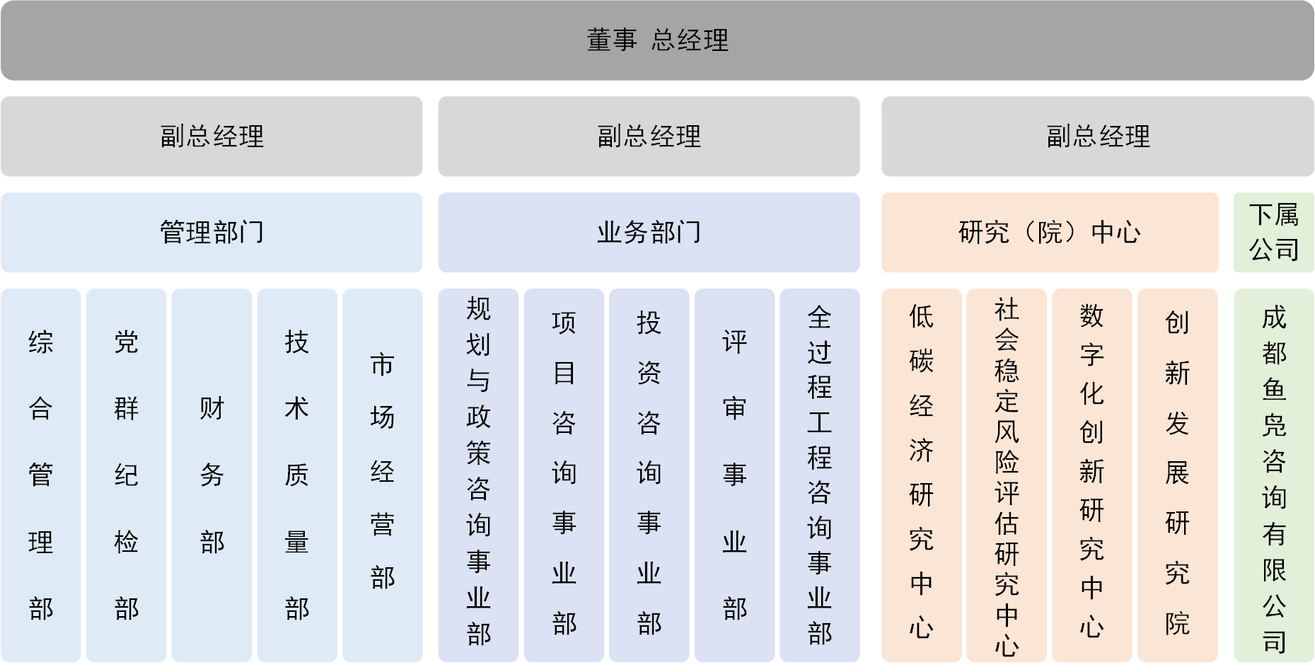 星空体育登录官网_星空(中国)本科及以上学历员工占比93%,硕士及以上学历员工占比47%;正高级工程师7人,高级工程师28人,拥有全国咨询工程师(投资)、全国注册造价工程师以及注册城乡规划师等各类专业技术资格人才占比超过65%。星空体育登录官网_星空(中国)下设11个部门,4个研究(院)中心。其中,业务部门6个,包括规划与政策咨询事业部、项目咨询事业部、投资咨询事业部、评审事业部、造价咨询事业部和项目管理事业部;4个研究(院)中心分别为低碳经济研究中心、社会稳定风险评估研究中心、数字化创新研究中心和创新发展研究院。为推动行业数字化、智能化转型发展,星空体育登录官网_星空(中国)还与西南交通大学经济管理学院共建工程咨询智能决策研究中心和产学研合作示范研究基地。星空体育登录官网_星空(中国)现有控股子星空体育登录官网_星空(中国)1家,为星空体育登录官网_星空(中国)与温江区属国有星空体育登录官网_星空(中国)合资成立的成都鱼凫咨询有限星空体育登录官网_星空(中国)。