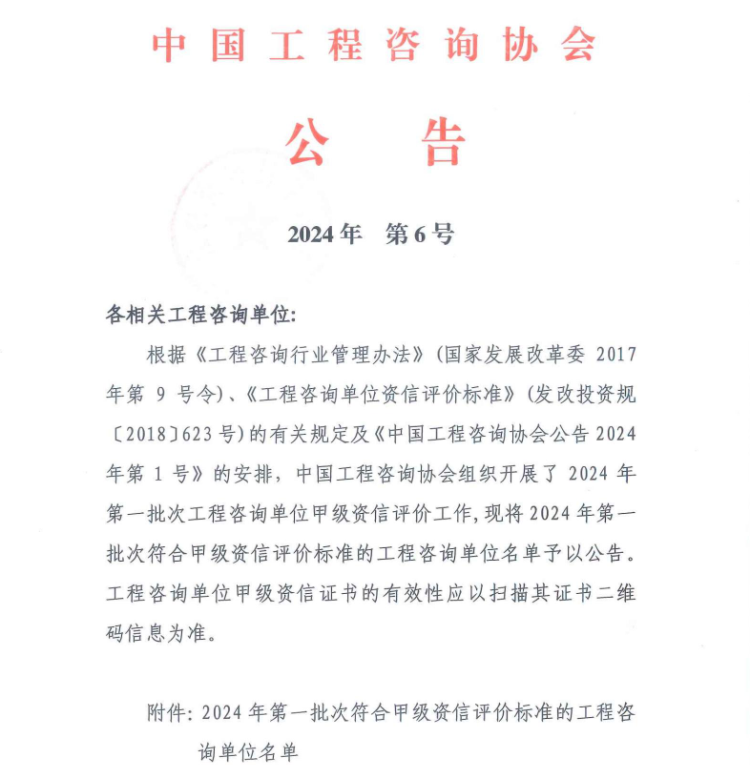 近日,星空体育登录官网_星空(中国)星空体育登录官网_星空(中国)顺利通过中国工程咨询协会2024年第一批次工程咨询单位甲级资信评价,再次成为四川省唯一同时持有工程咨询甲级综合资信、PPP甲级专项资信和甲级专业资信的综合性咨询机构。